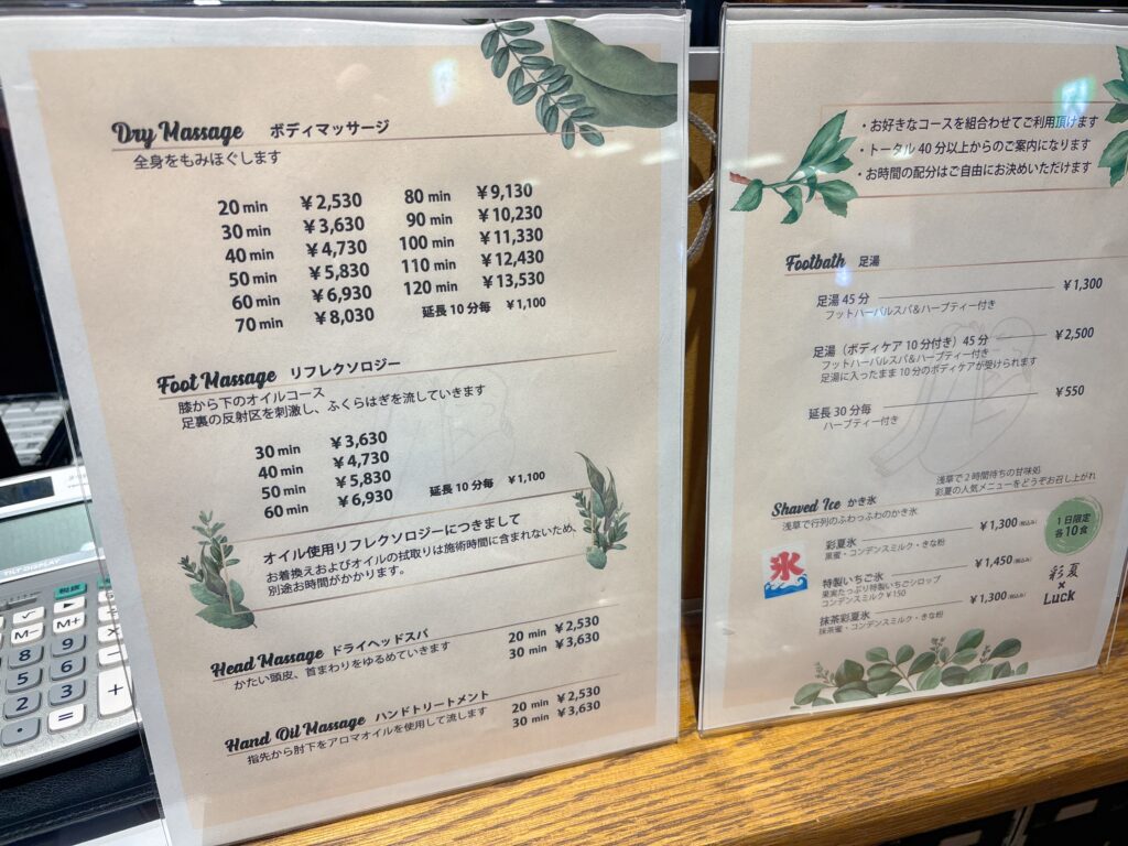 足湯カフェ&ボディケア LUCKのメニュー表は以下の通りです。