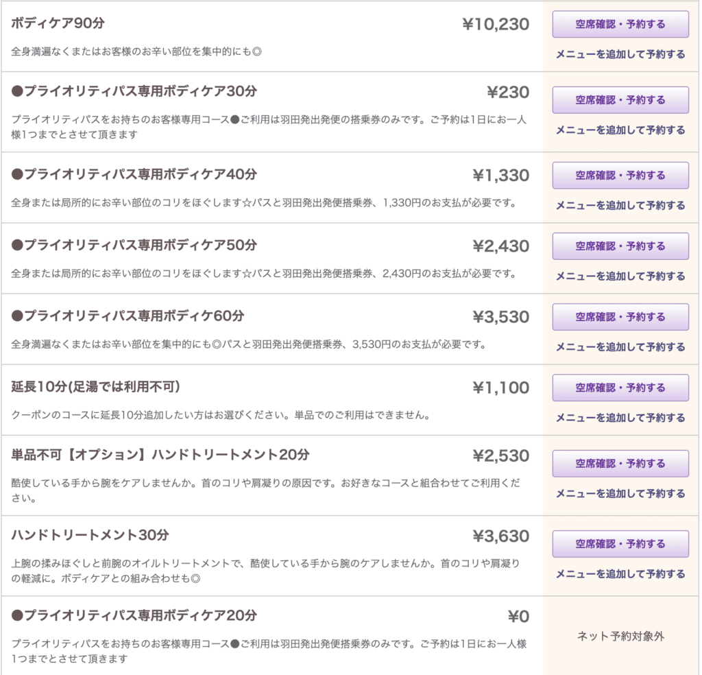 ホットペッパービューティーの予約ページに進むと、メニュー一覧の中にプライオリティパス特典の足湯+スイーツセットもしくは揉みほぐしのメニューが用意されています。
