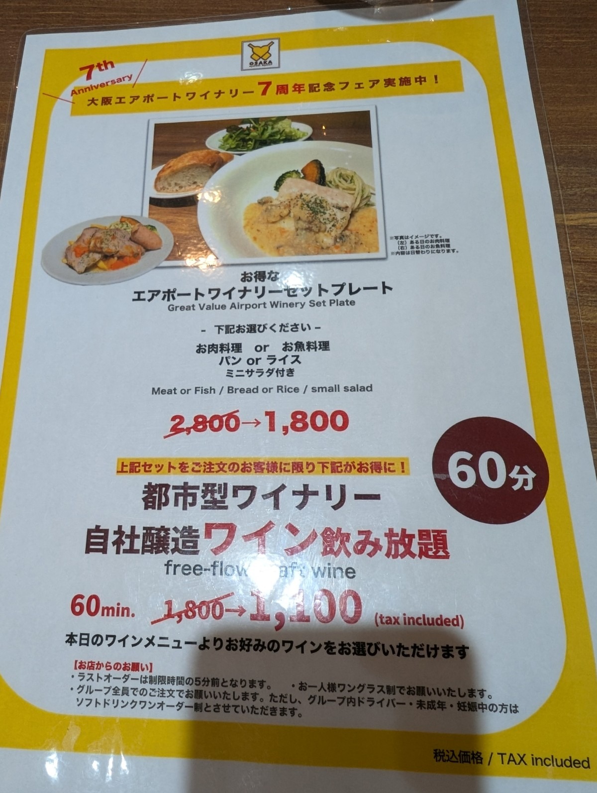 肉料理もしくは魚料理から選べ、パンもしくはライスとミニサラダが付いている「エアポートワイナリーセット」が、通常2,800円のところ1,800円になっていたのです。