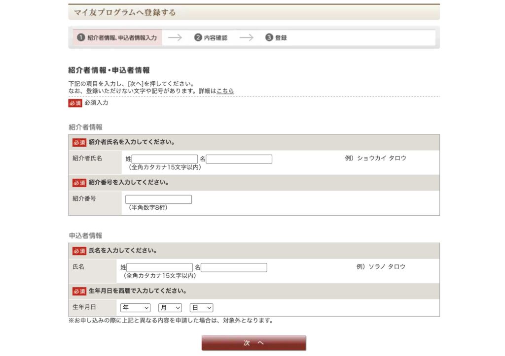 「マイ友プログラムに登録する」のページでは、「紹介者情報」と「申込者情報」を記入する仕組みになっています。