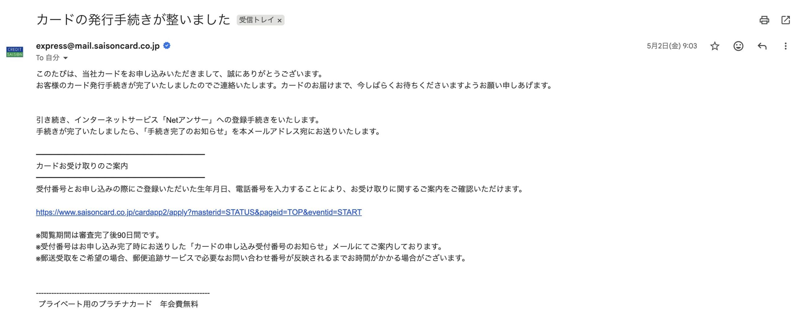 審査に通過すると、「カードの発行手続きが整いました。」という件名のメールが届きます。